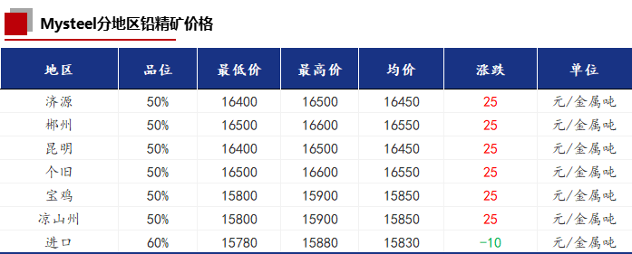 今日受铅锭价格影响,铅精矿价格较上一交易日涨25元/金属吨。铅精矿加工费各地区均未调整,较上一交易日持平。进口铅精矿价格较上一交易日跌10元/金属吨。