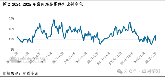 节日期间及节后首周,聚丙烯供应保持稳中有增的态势。截至2月3日当周,聚丙烯周产量达到7.39万吨,处在1月份以来的中等偏上水平。新产能方面,2024年12月,裕龙石化与内蒙古宝丰分别新增了110万吨和50万吨的聚丙烯产能。春节期间,内蒙古宝丰另一条50万吨生产线顺利投产并产出合格产品,进一步增强了聚丙烯市场的供应量。存量装置方面,尽管徐州海天、广西鸿谊、青岛金能、京博石化、绍兴三圆、中景石化、潍坊舒肤康及洛阳石化等企业在春节前后进行了部分生产线的检修或停车操作,导致停车比例有所上升,但从整体来看,当前的停车比例并不高,对总体供应量的影响有限。因此,聚丙烯市场来自供应增长的施压仍在持续。