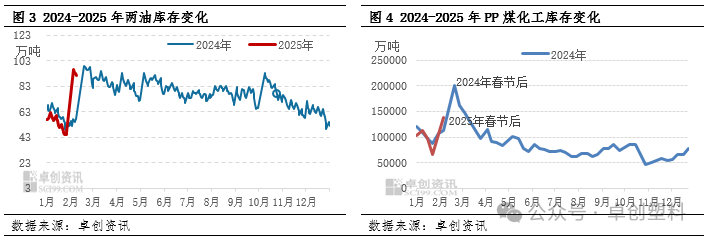 值得关注的是,尽管生产端的增量压力持续,但节后产业链整体库存压力不大,这在一定程度上缓解了市场的悲观情绪。上游库存方面,虽然春节假期导致生产企业出现一定程度的累库,但得益于节前预售表现良好,节后上游企业整体库存水平低于预期。具体而言,两油库存同比处于中性水平,而煤化工企业的库存则低于去年同期。在社会库存方面,自去年11月以来,贸易商库存持续下降,节前库存处于较低水平。节后虽然贸易商库存出现惯性累积,但整体库存低于去年同期。而下游方面,根据卓创资讯调研,工厂节前备货力度有限,节后库存同样低于往年水平,这有望为后续复工后的需求提供支撑。