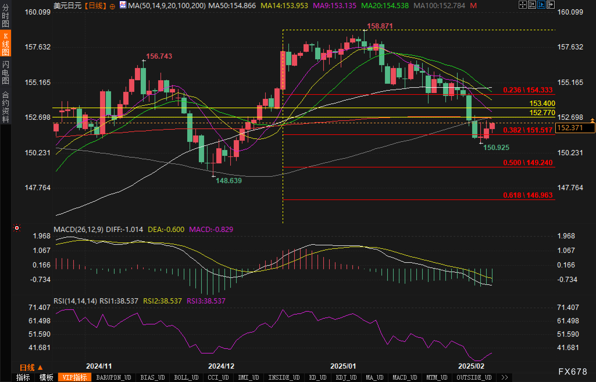 从技术形态来看,美元兑日元自2025年1月10日高点158.87以来一直处于短期下行趋势中。根据斐波那契回调位计算,139.57至158.87这一波段的38.2%回档水平在151.50附近,该位置在近期多次提供一定支撑,形成短期底部形态。当前价格在151.50上方,但整体仍处于较为谨慎的修正走势当中。