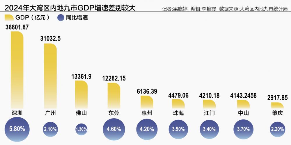 近日,广东21个地市2024年经济数据悉数公布,大湾区内地9市继续为广东经济挑大梁。2024年,在广东14万亿元GDP中,9个城市GDP占比近八成,达到115365.1458亿元。