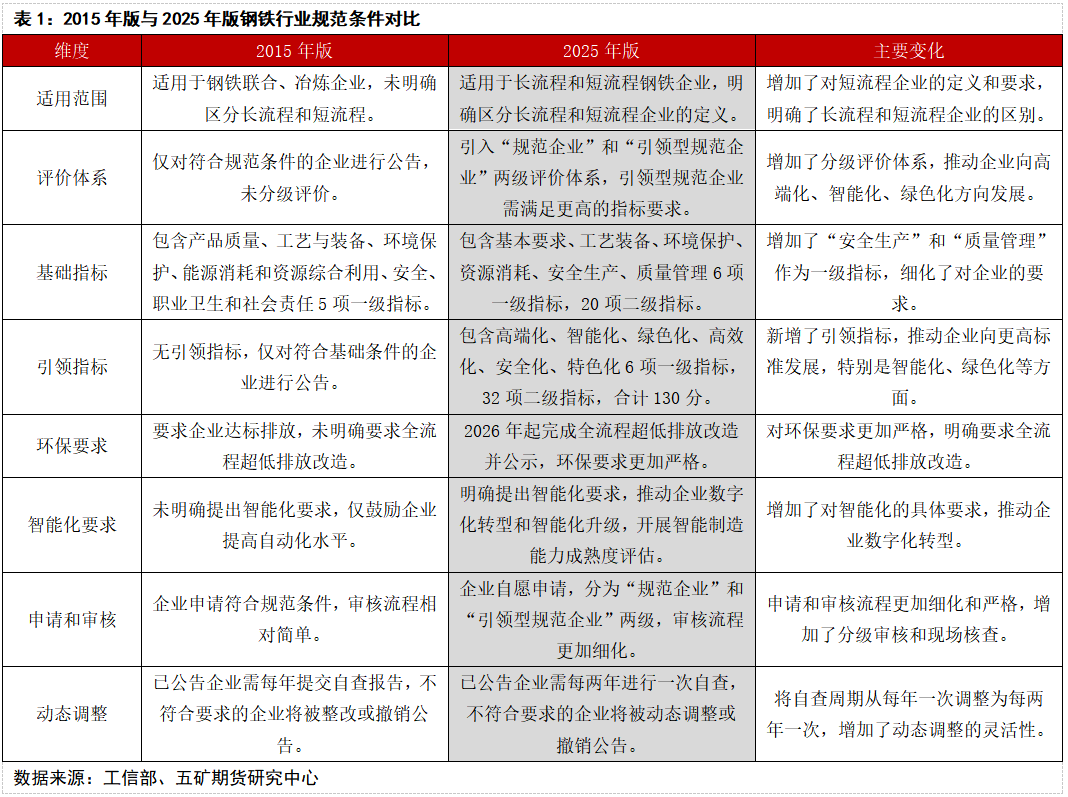 与《钢铁行业规范条件(2015年修订)》相比(以下简称“2015年版”),本次发布的《钢铁行业规范条件(2025 年版)》在诸多方面发生了变化和条件,我们认为主要有以下几点: