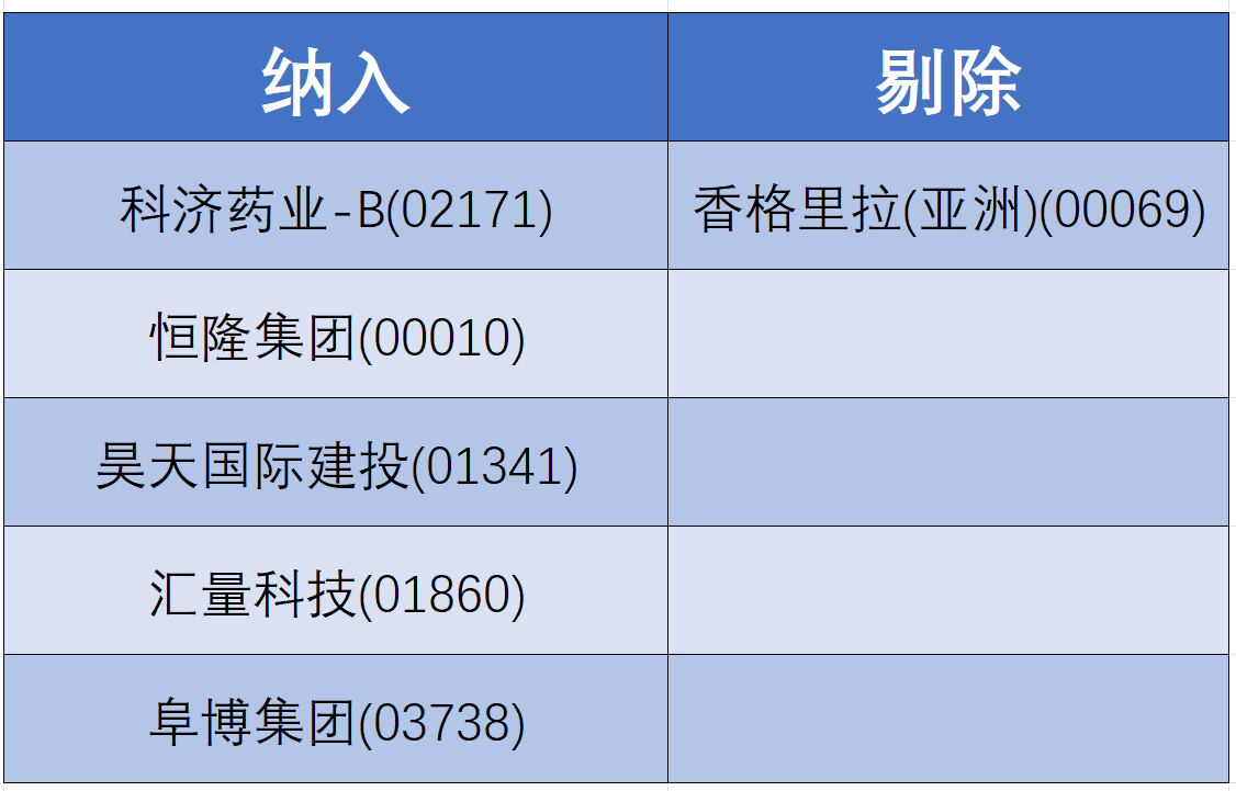 此外,MSCI全球小盘股指数于香港地区纳入科济药业-B(02171)、恒隆集团(00010)、昊天国际建投(01341)、汇量科技(01860)、阜博集团(03738)5只个股,同时剔除香格里拉(亚洲)(00069)1只个股。