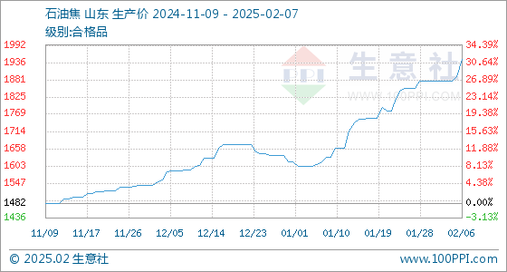 2月7日,生意社石油焦基准价为1946.00元/吨,与本月初(1877.50元/吨)相比,上涨了3.65%。