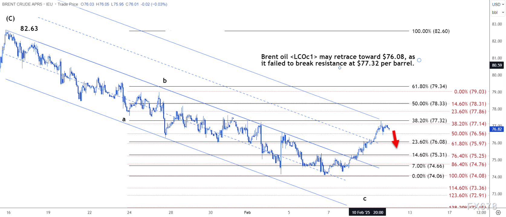 汇通财经APP讯——路透技术分析师周三(2月12日)指出,布伦特原油可能回撤至76.08美元,因为未能突破每桶77.32美元的阻力位。