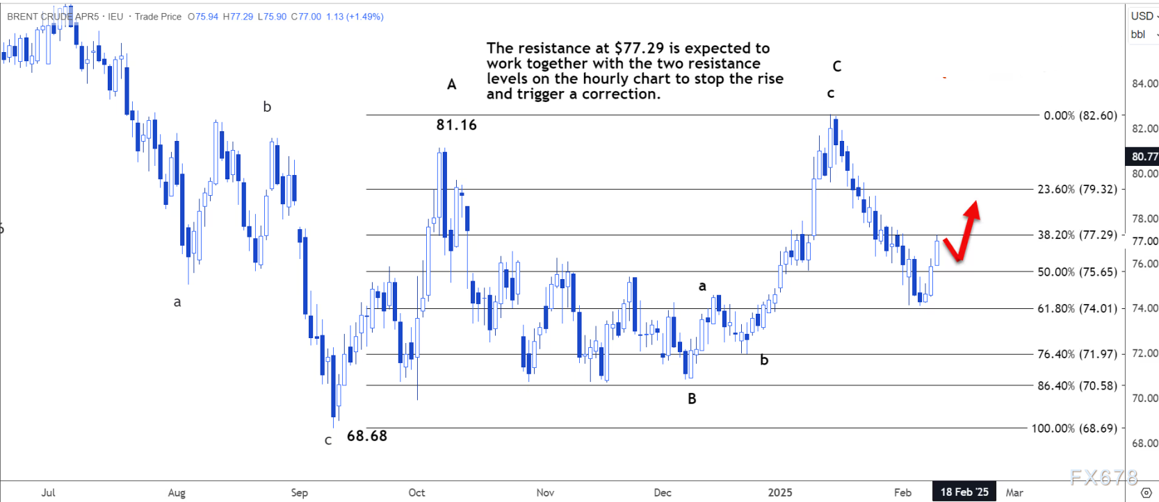 日线图上看,预计阻力位77.29美元将与小时图上的两个阻力位共同作用,阻止上涨并引发修正。