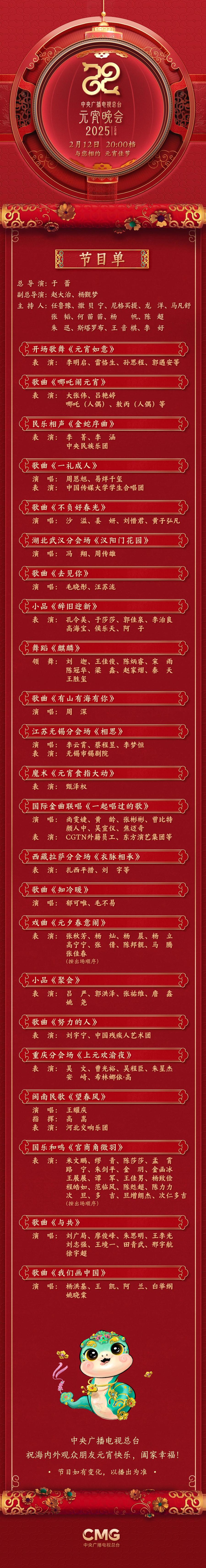 今晚8点档,中央广播电视总台《2025年元宵晚会》将在央视综合频道(CCTV-1)、综艺频道(CCTV-3)、中文国际频道(CCTV-4)、音乐频道(CCTV-15)以及4K超高清频道、8K超高清频道等电视频道,音乐之声、经典音乐广播、文艺之声、粤港澳大湾区之声、台海之声、华语环球广播、南海之声等广播频率,央视新闻、央视频、云听客户端、央视网、央广网、国际在线等新媒体平台,以及“百城千屏”8K超高清传播平台同步播出。