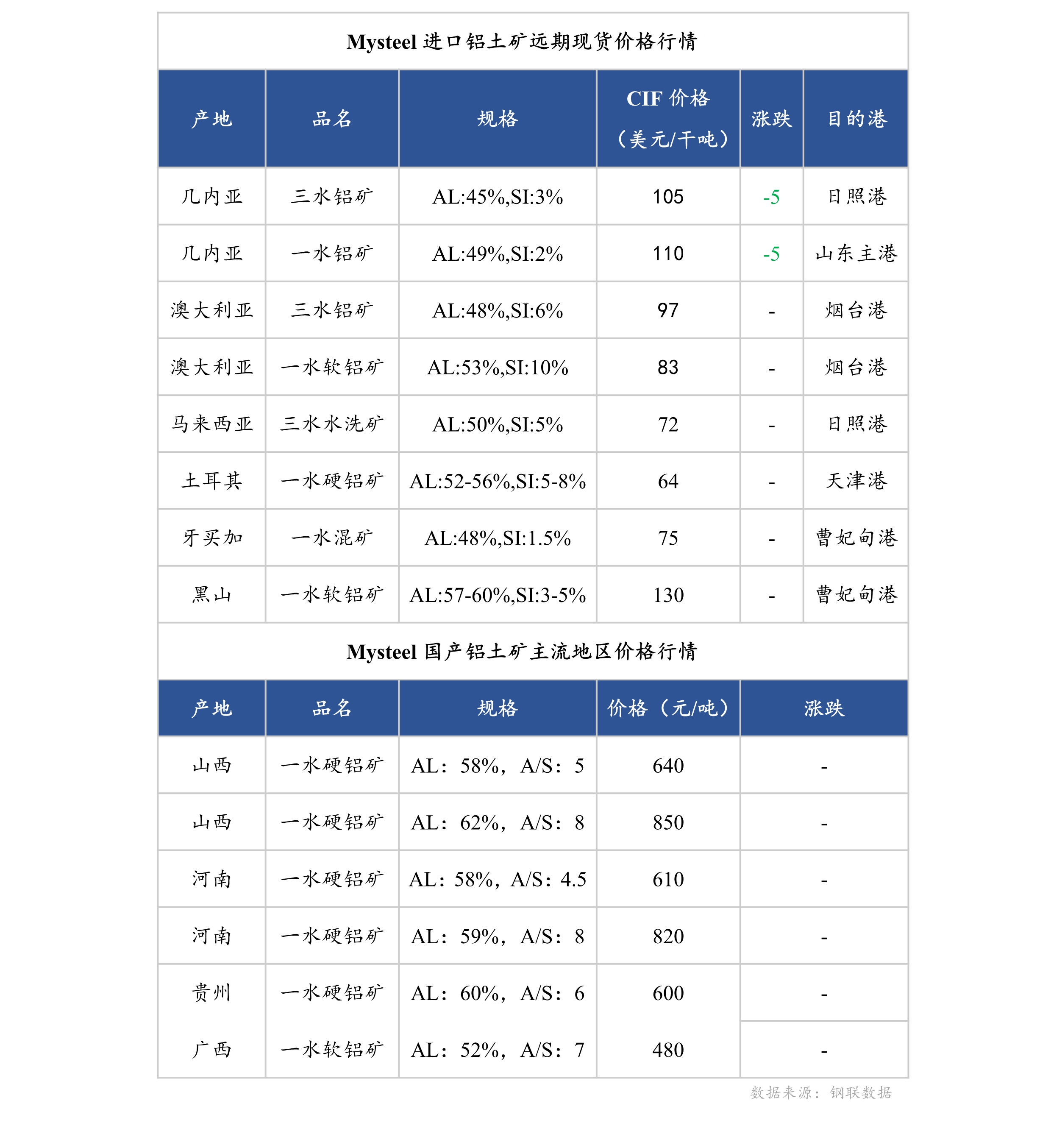 2月12日,国产铝土矿价格持稳,进口矿价格下跌。氧化铝价格继续下跌,氧化铝企业对矿石采购持观望态度,价格利好因素减弱。市场上对铝土矿价格看空情绪蔓延,矿石询报盘价格继续下探。