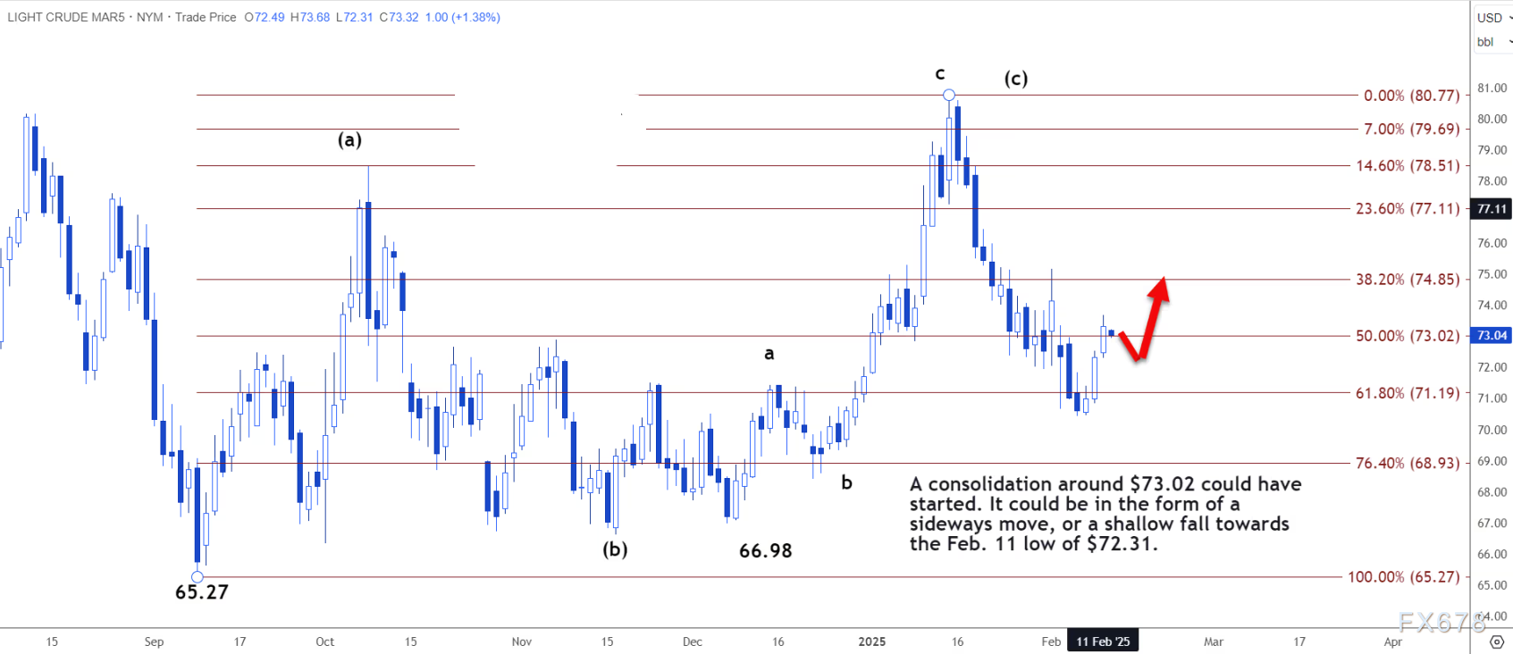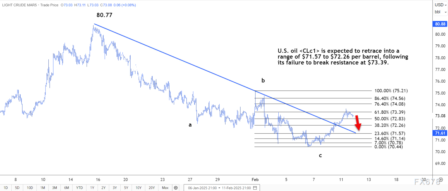 汇通财经APP讯——路透技术分析师周三(2月12日)指出,美国原油价格未能突破73.39美元的阻力位,预计将回撤至每桶71.57至72.26美元的区间。