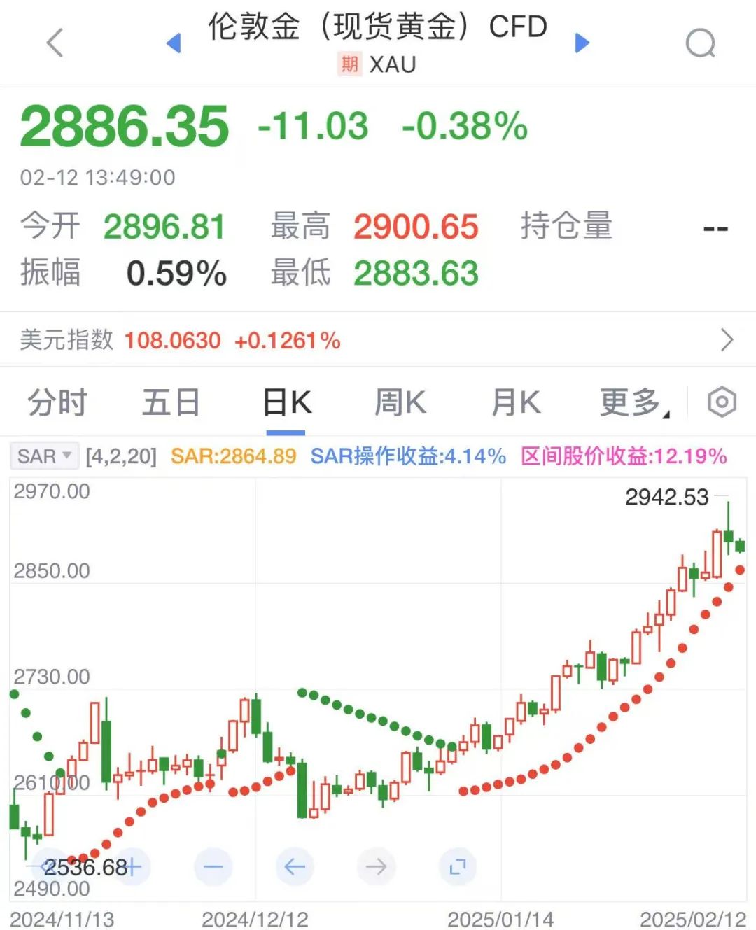 2月12日,截至发稿时,伦敦金价格回落至2900美元/盎司下方,盘中低点2883.63美元/盎司。美联储主席鲍威尔在美国国会的证词表态暂缓降息,缓和了市场恐慌情绪,叠加市场获利回吐等因素,造成国际金价回落。国际金价自2942美元/盎司历史高位回落后,等待本周更多美国经济数据指引。