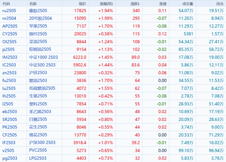 沪深300股指期货(IF)主力合约涨1.02%,上证50股指期货(IH)主力合约涨1.10%,中证500股指期货(IC)主力合约涨1.44%,中证1000股指期货(IM)主力合约涨1.45%。
