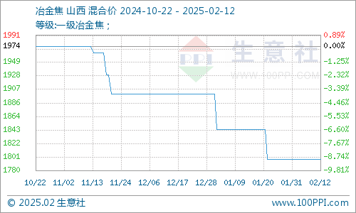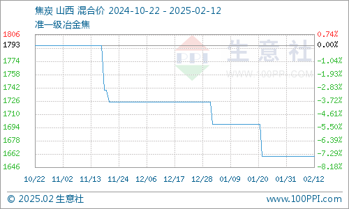 据生意社商品行情分析系统:2025年2月12日山西地区焦炭市场持稳运行,均价是1698.33元/吨,山西地区冶金焦价格下行,均价是1844元/吨,目前焦炭市场价格持稳运行为主,下游刚需采购,库存高位。