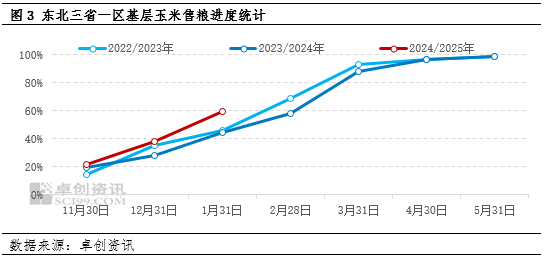 通过市场调研了解,目前市场看涨情绪仍存,利多因素持续影响市场,预计正月十五后东北玉米价格仍有小幅上涨空间。第一,春节前东北三省一区基层玉米售粮进度处于近三年同期最高水平。卓创资讯监测数据显示,截至1月末,东北基层平均玉米售粮进度为59.25%,较去年同期偏快14.5个百分点。由于目前东北气温较低,以及部分地区受降雪影响,基层售粮进度缓慢,预计正月二十(2月17日)后售粮进度将加快。由于市场看涨氛围浓厚,基层农户多惜售,贸易商随收随走,多消化春节前库存。