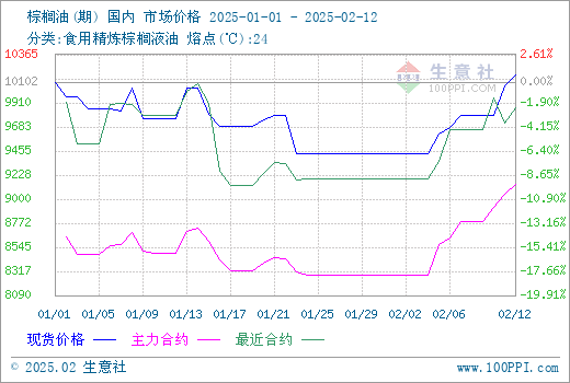 期货:春节期间,外盘油脂行情上扬,节后开盘,棕榈油行情迎来补涨,国内期货行情不断走高,截止2月12日,连棕榈油主力合约收9154元/吨,单日上涨102元/吨,较节前上涨超5%。国内棕榈油期货行情拉涨,现货行情跟盘上涨。2月以来,棕榈油行情强势上涨,现货价格突破万元大关,涨幅超700元/吨。