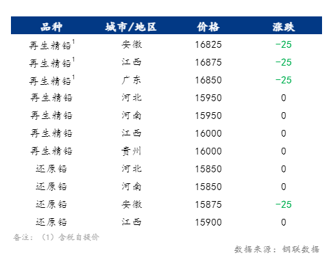 据Mysteel数据显示,今日精废差为75元/吨,较上一交易日持平,日内1#铅锭价格下跌25元/吨报16925元/吨。现货市场方面下游接货意愿欠佳,炼企精铅报价跟跌铅价,价格有所下调,其中河南、四川企业维持平水至升水报价,安徽市场部分持货商贴水50-80元/吨出厂。