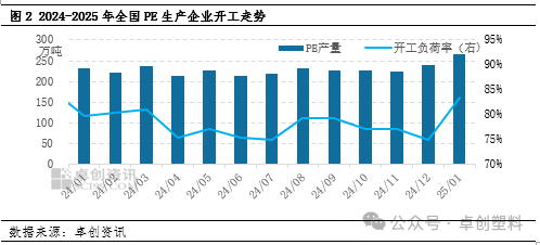 2025年1月份国内PE开工负荷在83.45%,较2024年12月份增加8.43个百分点,较去年同期增加3.71个百分点。裕龙石化、内蒙古宝丰等新投企业产能增量较多,且国内石化装置检修有所减少,整体开工负荷率有所提升,故1月份国内聚乙烯产量环比增量明显。