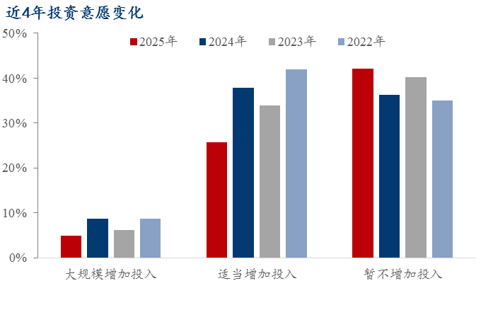 4、企业对2025年发展预期持中性态度。53.38%的企业对经济前景预期维持中性,与上年相比增加3.12个百分点,42.1%的企业表明暂无增加投入计划,企业心态仍然保持谨慎。