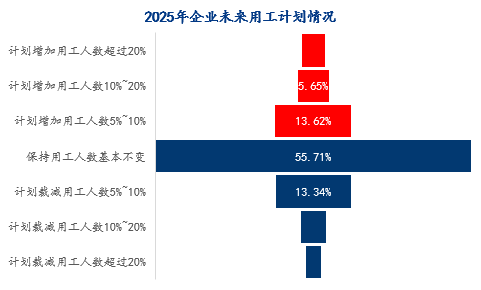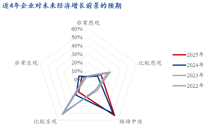 企业对2025年经济增长预期趋于保守,53.83%的企业持中性态度,较2024年上升3.12个百分点,反映出市场信心进一步弱化。这种谨慎心态与投资意愿下降、招工计划收缩相呼应,表明企业对经济复苏持观望态度。