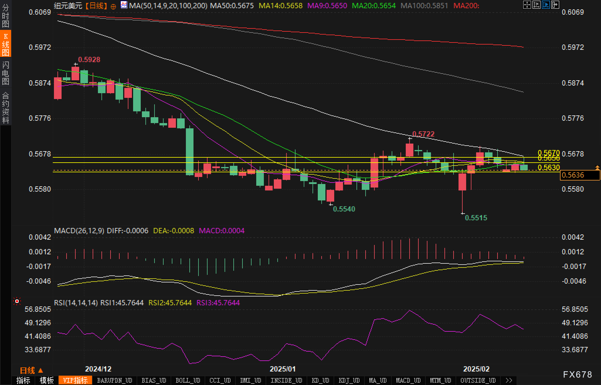 首先,当前的支撑位在0.56300附近,自2月4日以来,该位置已经多次发挥作用,显示出较强的支撑性。这个支撑位被视为短期内的买入区域,尤其是当市场再次回落至此水平时,可能会吸引一定的买盘。然而,若价格突破0.56300支撑位,可能会进一步下探至0.56000以下。