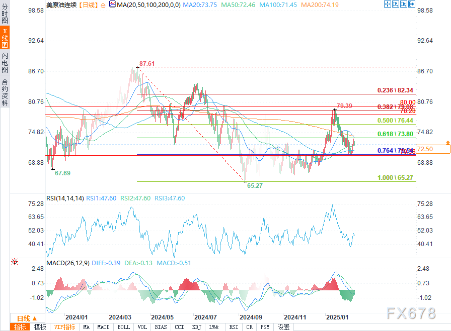 汇通财经APP讯——周三(2月12日)欧盘时段,轻质原油期货走低,可能终结为期三天的空头回补反弹行情。此次回调增加了对关键技术支撑位——72.42美元这一50%回撤位进行测试的可能性。若该支撑位失守,交易者可能会将50日移动均线71.37美元、200日移动均线70.72美元和70.38美元的斐波那契水平视为下行目标。