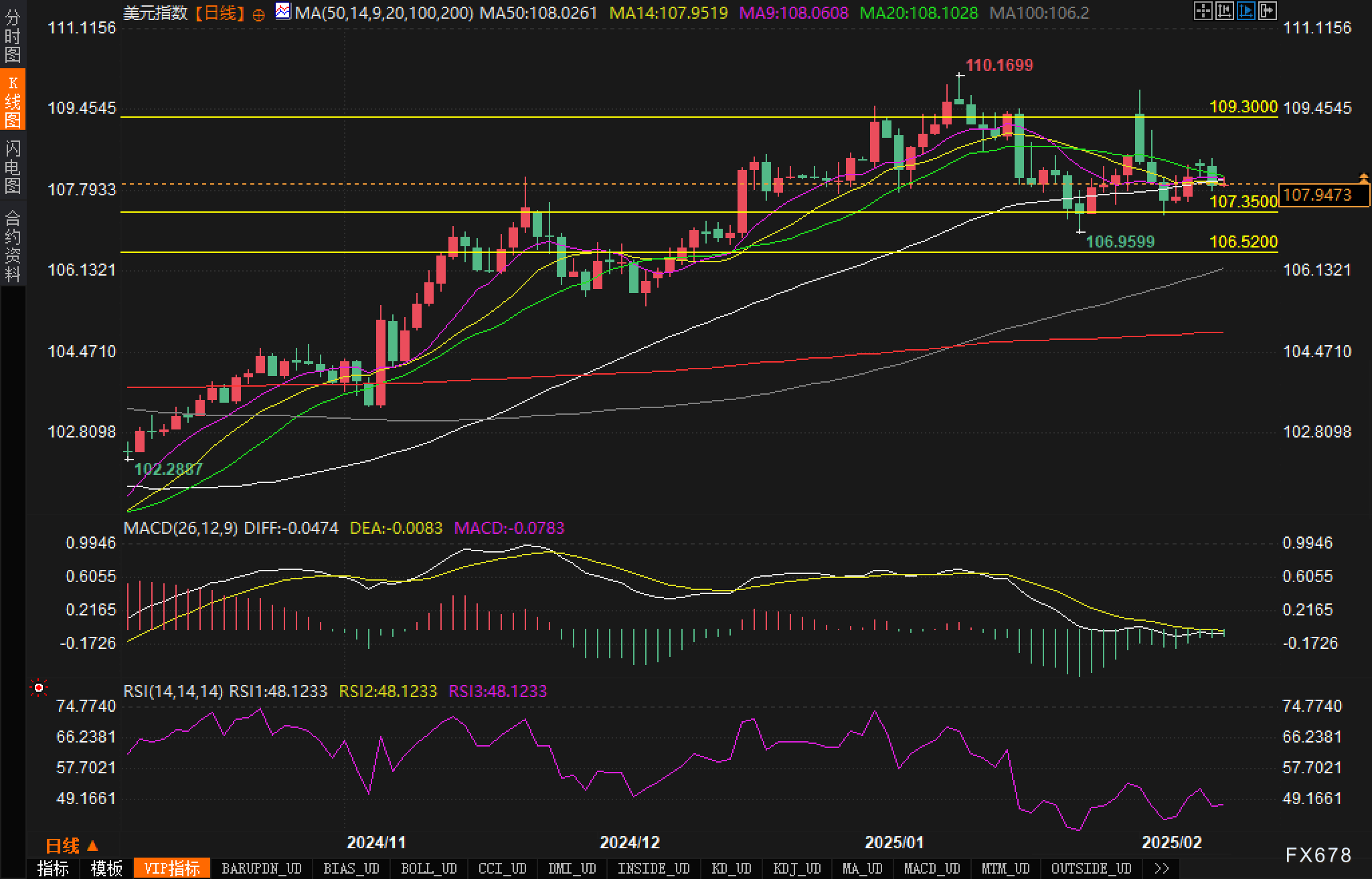 从更长期的技术图形来看,美元指数近期呈现出一定的上升通道。虽然目前价格面临震荡整理,但这一通道内的上行趋势依旧未受到实质性破坏。如果价格能够保持在这一通道内震荡上行,且有效突破109.30的阻力,美元指数可能会继续向上挑战新的高点。然而,如果价格跌破107.35支撑位,则有可能引发一轮更为深度的回调,甚至可能向106.21或更低的水平回落。