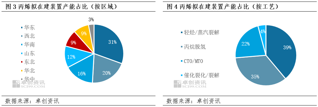 主要区域及主要工艺在丙烯拟在建产能中占比最大