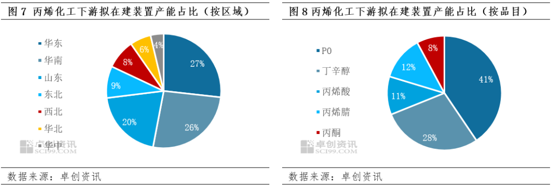 未来五年,丙烯化工类下游拟在建产能同样较多,产能地区分布广泛。未来五年,丙烯化工类下游拟在建产能约2500万吨,在丙烯下游拟在建总产能中的占比约46%。丙烯化工类下游拟在建产能主要以环氧丙烷和丁辛醇为主,由于环氧丙烷及丁辛醇前期盈利良好,因此新增产能规划数量相对较多。新增产能主要分布在华东、华南和山东地区,多数新增产能同样配套有原料丙烯装置。