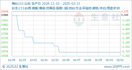 2月13日,生意社棉纱21S基准价为22566.67元/吨,与本月初持平。