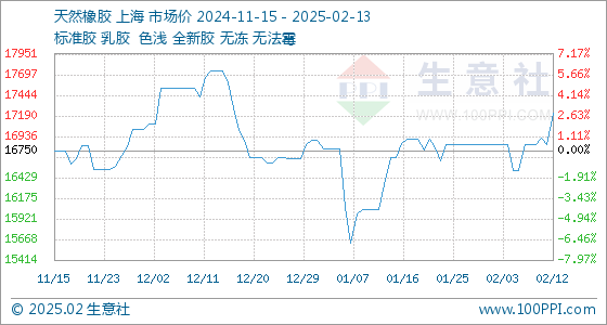 2月13日生意社天然橡胶基准价为17225.00元/吨