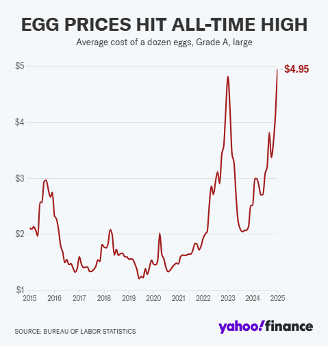 根据美国政府的最新数据,消费者在超市购买一打大号A级鸡蛋的平均价格为4.95美元,但这仍然比杂货店的价格便宜3美元以上。大宗商品研究公司Expana的数据显示,周三,鸡蛋批发价格达到每打8.15美元,是1985年以来的最高水平。