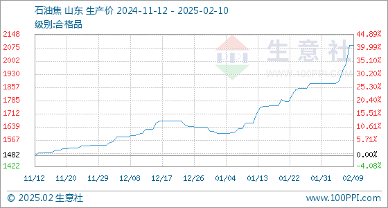 2月10日,生意社石油焦基准价为2087.50元/吨,与本月初(1877.50元/吨)相比,上涨了11.19%。