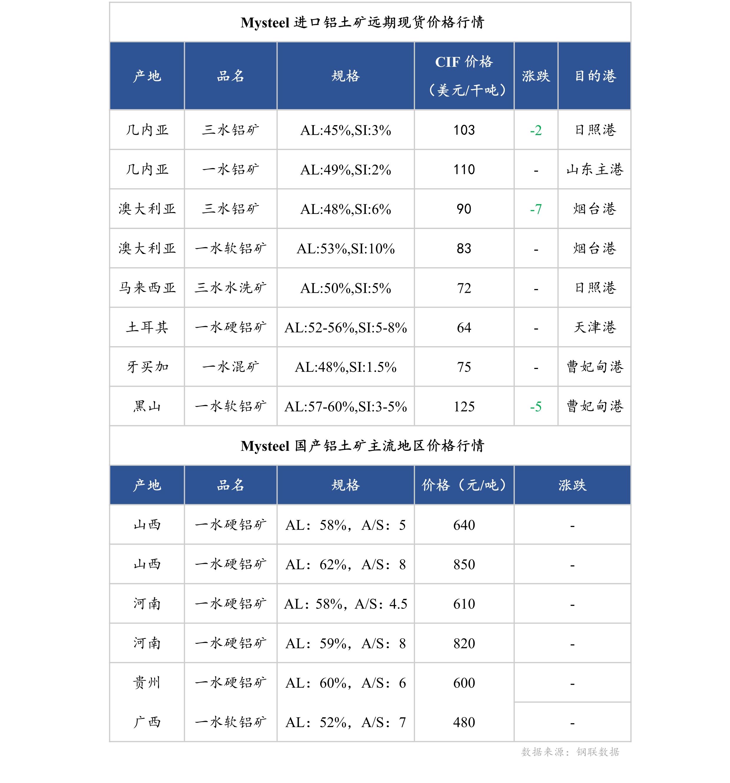 2月13日,国产铝土矿价格持稳,进口矿价格继续下跌。氧化铝现货价格持续下跌,国内部分氧化铝厂已处于盈亏边缘 ,氧化铝企业对矿石采购持观望态度,价格利好因素减弱。铝土矿价格承压,但铝土矿现货市场未见明显过剩,买卖双方处于价格博弈阶段。