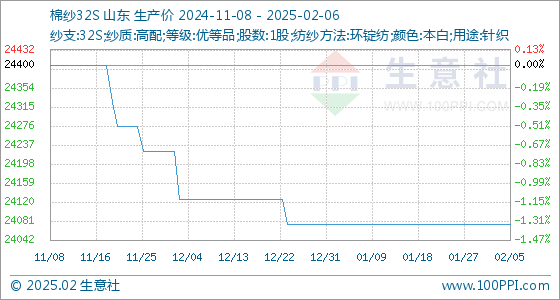 2月6日,生意社棉纱32S基准价为24075.00元/吨,与本月初持平。