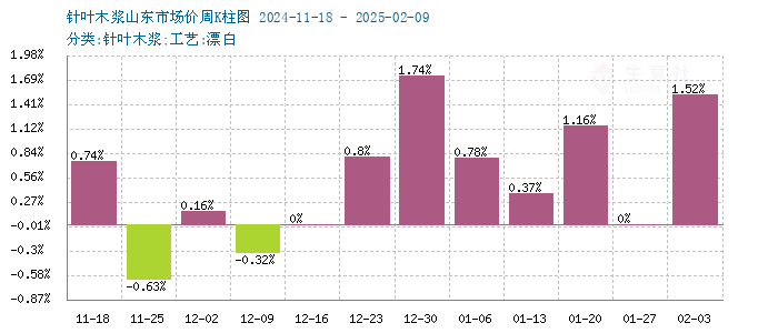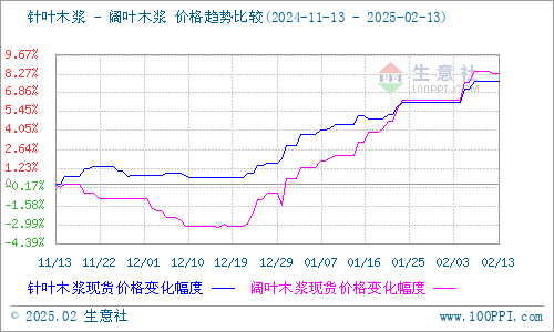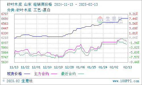 据生意社商品行情分析系统监测:本周针叶木浆价格平稳运行,阔叶木浆价格则稍有下探。2025年2月13日针叶木浆山东地区市场均价为6700元/吨,与2月9日均价相比保持平稳。2月13日阔叶木浆山东地区市场均价为4970元/吨,与2月9日均价相比下降了0.2%。