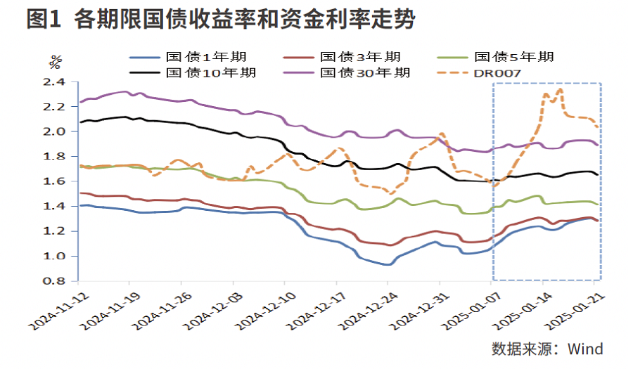 2024年12月以来,国内债券收益率持续下行。10年期国债收益率最低在1月6日下行至1.5966%,但随后略有反弹,最高至1月20日的1.6747%。