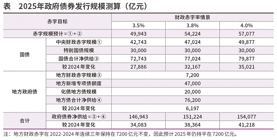 首先,需密切关注3月两会期间公布的财政刺激政策是否会超预期。目前市场预期2025年的财政赤字率升至4.0%,特别国债发行规模或为3万亿元。2024年地方政府新增专项债额度为39000亿元,若考虑化债的亿元和收储,2025年新增额度或明显大于2025年,假设新增地方政府专项债额度47000亿元(39000亿+8000亿元),加上一次性化隐债的2万亿元,预计2025年政府债券净供给为15.4万亿元,较2024年增加4.1万亿元。
