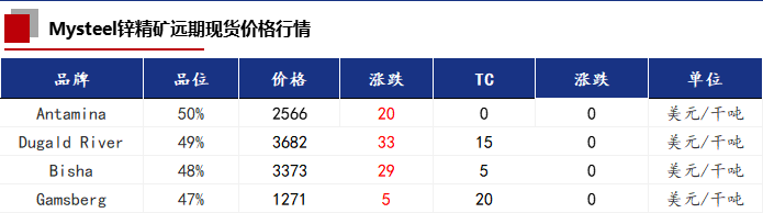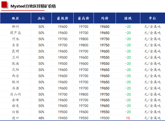 今日国内锌精矿加工费各地区均未调整,和上一交易日持平。受锌价的影响,锌精矿价格下降20元/金属吨。进口TC今日暂无变化,主流报价0-20美元/干吨。