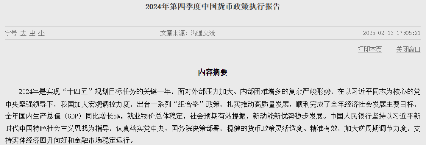 2月13日,中国人民银行(下称“央行”)发布《2024年第四季度中国货币政策执行报告》(下称“《报告》”),总结过去一年货币政策执行情况,部署下阶段施策方向。