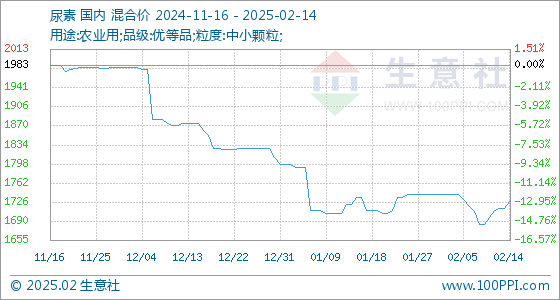 2月14日,生意社尿素基准价为1715.00元/吨,与本月初(1741.67元/吨)相比,下降了-1.53%。