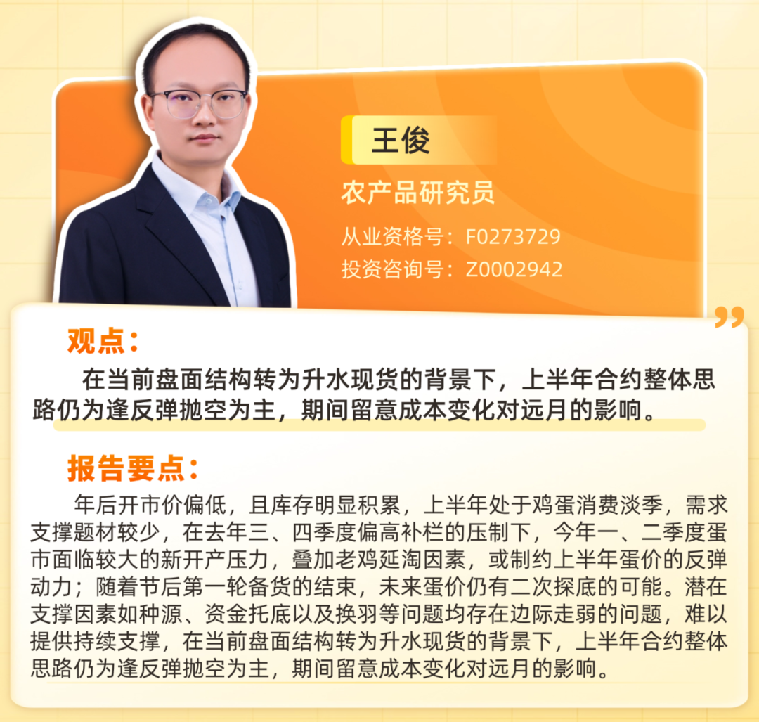 综上,年后开市价偏低,且库存明显积累,上半年处于鸡蛋消费淡季,需求支撑题材较少,在去年三、四季度偏高补栏的压制下,今年一、二季度蛋市面临较大的新开产压力,叠加老鸡延淘因素,或制约上半年蛋价的反弹动力;随着节后第一轮备货的结束,未来蛋价仍有二次探底的可能。潜在支撑因素如种源、资金托底以及换羽等问题均存在边际走弱的问题,难以提供持续支撑,在当前盘面结构转为升水现货的背景下,上半年合约整体思路仍为逢反弹抛空为主,期间留意成本变化对远月的影响。