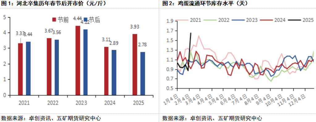 鸡蛋现货存在着明显的季节性,春节后现货多以弱势下滑为主。一方面供应端库存积累,蛋鸡在春节期间照常生蛋,但流通市场因春节假期而关闭,积压的库存容易在节后形成抛压;其次春节期间交易市场关闭,老鸡淘汰受阻,增加额外的供应;三是节后属于消费淡季,市场备货需求持续性差。今年节后开年存在几个特点,一是开市价偏低,节前节后跌幅大,产区方面,河北辛集开年价2.78元/斤,位于多年以来的偏低位置,较节前下跌1.15元/斤,跌幅偏大;产区方面,北京开年价为3.05元/斤,一度倒挂周边红蛋产区,侧面印证产区库存压力偏大,绝对位置同样位于多年低点附近。其次是库存积累较为明显,开年后流通环节库存平均达到1.71天,生产环节1.97天,处于近几年高位,间接证明存栏量不小,需求一般背景下,供应规模存在过剩的疑虑。
