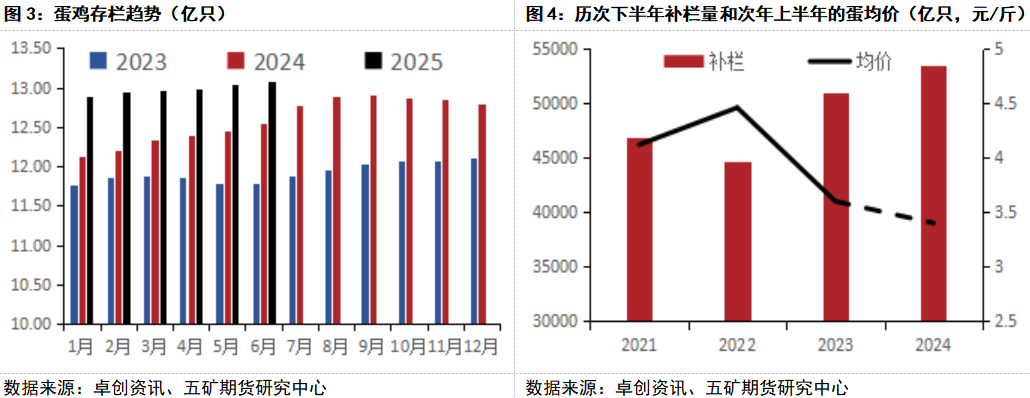 去年上半年市场预期较为悲观,蛋价持续运行在成本价以下,最终导致超淘发生,随后种源问题以及由此衍生的鸡苗存活率、产蛋率不高等问题爆发,24年下半年蛋价整体强于预期。尤其在成本端明显走弱的背景下,养殖盈利较为可观,持续同比偏高,养鸡赚钱的示范效应,带动补栏量持续走高,鸡苗价格也居高不下,奠定了今年上半年新开产以及存栏偏高且持续增加的基础。另外,尽管成本端在节后小幅抬头,但淡季养殖尚有盈利,导致淘鸡走量依旧不畅,鸡龄持续偏高,淘鸡-白鸡价差同样处于同期偏高位置,增加了额外的供应。从补栏趋势看,去年三、四季度补栏量同比明显偏高,或导致今年一、二季度新开产持续增加,而去年三、四季度累计补栏量超过23年同期,因此大概率今年上半年鸡蛋均价也会弱于24年上半年(图4)。总结来看,供应规模偏大且有仍有增多趋势,或压制上半年的蛋价表现,未来蛋价存在二次探底且均价弱于24年同期的可能。