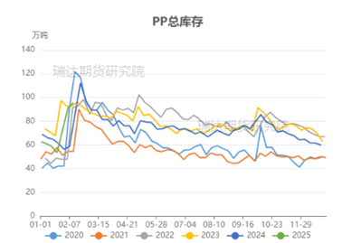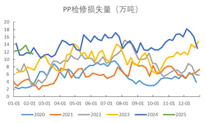 春节期间,下游企业休假停工,上游生产企业照常生产,PP商业库存具有季节性累库趋势。从2019年至2024年数据看,春节后PP库存在70至113万吨范围,春节期间累库幅度在37%至118%区间波动。2025年春节后,PP库存较年前增长69.96%至90.91万吨,累库幅度不大,库存水平与往年节后相比偏低。较低的累库压力主要归功于上游装置低开工状态。据钢联数据,1月31日PP检修损失量当周值在11.86万吨,尽管较春节前有所下降,但依然高于往年同期水平。上游装置降负、检修部分缓解了1月底内蒙古宝丰二线50万吨新产能投产带来的供应压力。