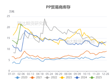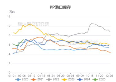 2月6日至12日,PP商业库存环比+5.26%至95.7万吨,维持累库趋势,库存处于同期中性区间。本周由于金能化学、海天石化、中英石化、绍兴三圆等装置重启,供应压力上升,同时下游制品企业复工偏缓、采购积极性一般,年后去库趋势未能显现,反而出现较大幅度累库。分构成来看:本周PP现货价偏坚挺,下游贸易商高价抵触,库存向下转移不畅,生产企业库存环比+8.55%,贸易商库存环比-4.78%;国内PP价格优势明显,出口订单成交放量,内地资源向港口转移,港口库存环比+6.79%。