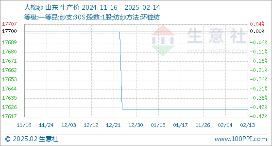 2月14日,生意社人棉纱基准价为17625.00元/吨,与本月初持平。