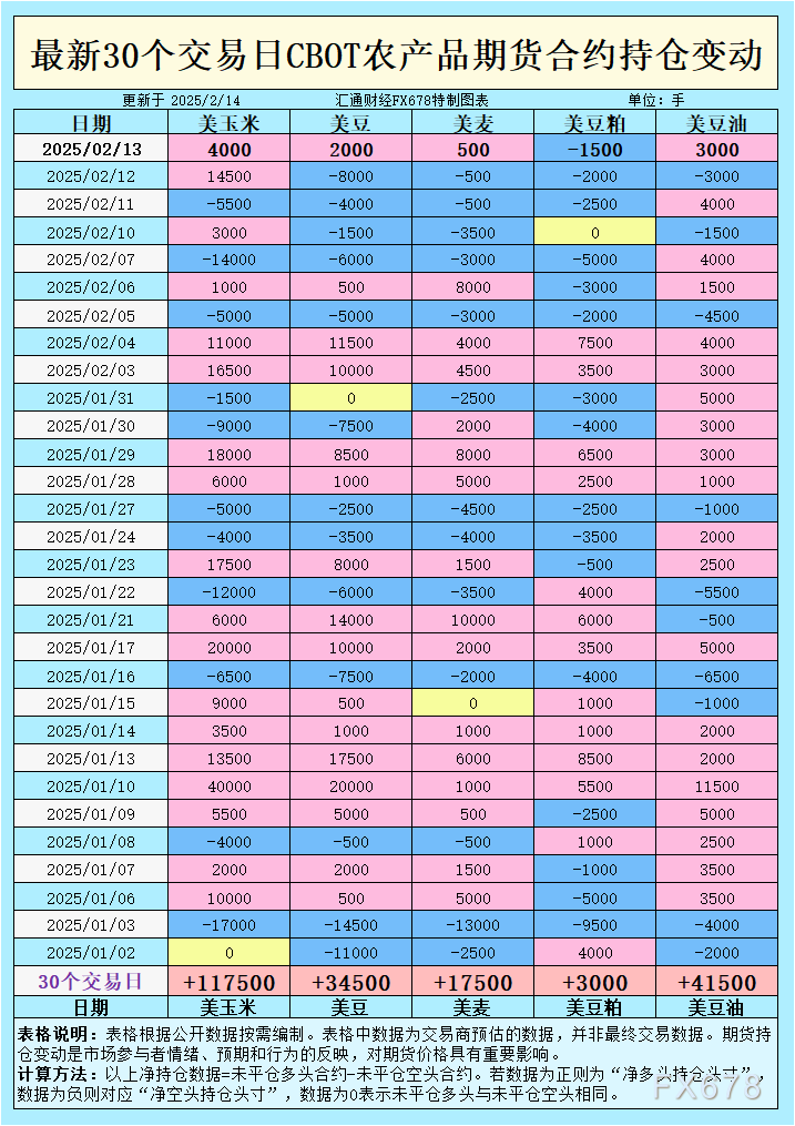 豆粕市场则表现较为疲弱,尤其是在基金的操作情绪上。2月13日,商品基金对豆粕的净空头持仓增加了1500份合约,显示出市场对豆粕需求的疲软预期。这与大豆出口的疲软及国内需求的回落相吻合,预计短期内豆粕市场将面临一定压力。