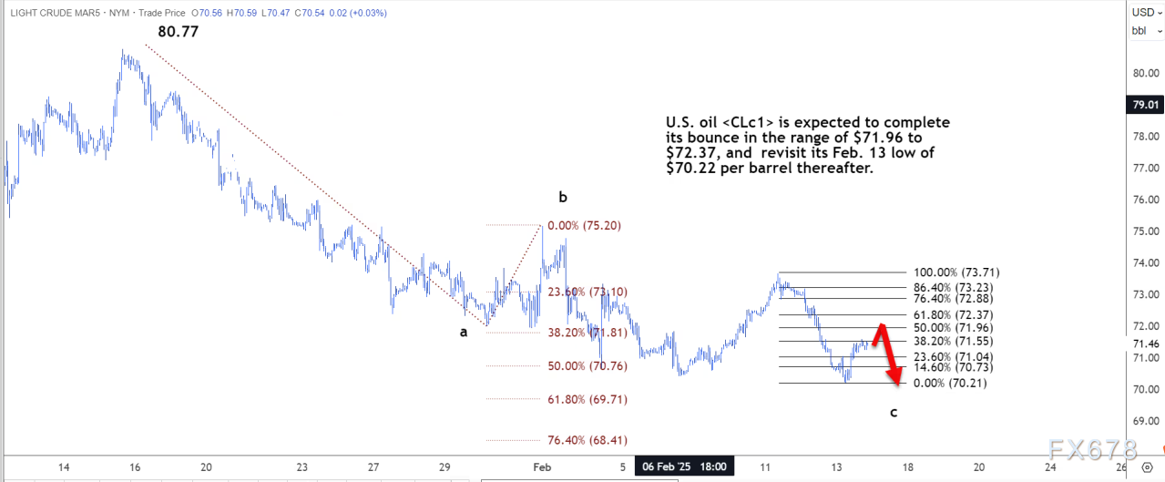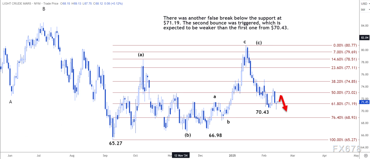 分析师指出,隔夜油价跌至70.22附近后反弹,此次反弹看起来像是对2月6日低点70.43美元支撑的反应,而不是对80.77美元下行趋势的逆转。