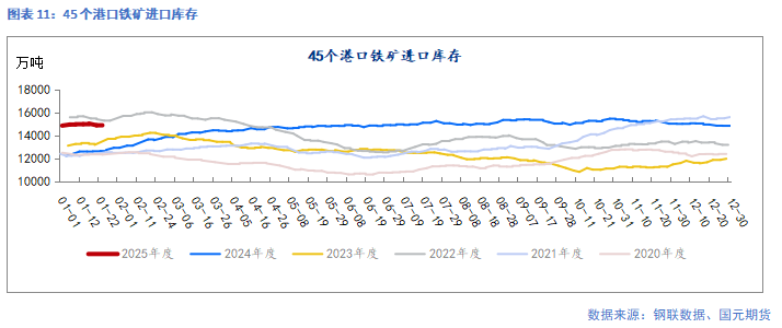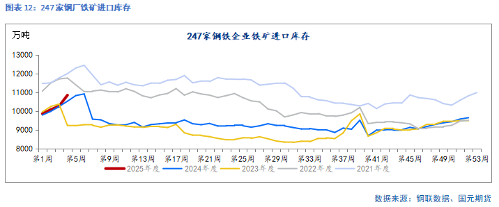 库存方面,港口库存维持高位,下游钢厂缓慢补库。钢联数据显示,截至1月21日,45港口库存为1.49亿吨,与上月末持平。截至1月24日,247家钢厂库存10846.32万吨,较上月末增加1202.2万吨,基本与去年节前水平持平。