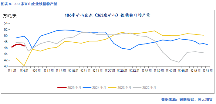 1月186家矿山企业日均产量维持46.83万吨/天,环比减少0.19万吨/天,同比下降2.40万吨/天。受到节假日影响,2月预计矿山开工率下降,国产矿供应仍有减量。