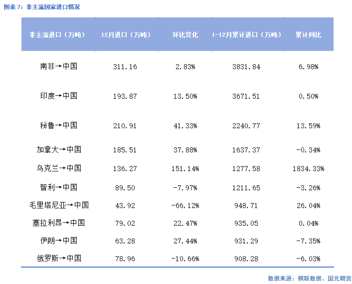 统计局数据显示,2024年中国铁矿进口量为12.38亿吨,同比增加5.00%,其中澳大利亚进口7.43亿吨,同比增加0.86%;巴西进口2.73亿吨,同比增加10.09%;非主流(除澳巴)进口铁矿2.21亿吨,同比增加14.29%。非主流方面,进口量居前的国家是南非、印度、秘鲁、加拿大。2024年,我国粗钢产量为10.05亿吨,同比下降1.37%。